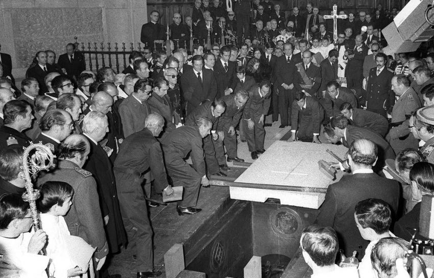 De hecho, allí sería sepultada su viuda, Carmen Polo, trece años después. Sin embargo, el gobierno español de la época, presidido por Carlos Arias Navarro, adoptó la decisión de manera no poco apresurada. La lógica era aplastante porque, en contra de lo que se repite últimamente hasta la saciedad, la construcción no fue concebida como monumento a la reconciliación de los dos bandos contendientes en la guerra fratricida. Por el contrario, como señalaba el decreto de 1 de abril de 1940, que impulsó los trabajos, la finalidad era levantar “el templo grandioso de nuestros muertos en que por los siglos se ruegue por los que cayeron en el camino de Dios y de la Patria”. Por si cabía alguna duda acerca de a quienes se honraba, se afirmaba que el lugar sería “un digno marco al campo en que reposen los héroes y mártires de la Cruzada”. Dentro de ese espíritu – a fin de cuentas Franco había sido esencial en la victoria – tenía sentido que el Consejo de Ministros presidido por Arias Navarro decidiera ese lugar del entierro. Sin embargo, fue el propio rey Juan Carlos quien, el 22 de noviembre de 1975, dos días después del fallecimiento de Franco, ordenó por escrito al entonces abad del Valle de los Caídos, Luis María de Lojendio, que se diese sepultura en la basílica a “Su Excelencia el Jefe del Estado y Generalísimo de los ejércitos de España”. Para el padre Lojendio, antiguo diplomático, no se trató de una tarea fácil porque no había nada preparado. Incluso por el lugar donde debían depositarse los restos mortales pasaban líneas de alta tensión y conducciones de aire que hubo que desviar para poder habilitar un espacio adecuado. Así, tras un velatorio público en el Palacio de Oriente en el que desfilaron ante Franco centenares de miles de españoles, a la una de la tarde del 23 de noviembre, llegaron los restos mortales a la basílica del Valle de los Caídos, donde recibieron sepultura ante unos cinco mil asistentes. Comenzaba la Transición y Franco, contra lo que muchos piensan ahora, quedaba definitivamente atrás. Quizá eso fue lo que buscaba la decisión regia.