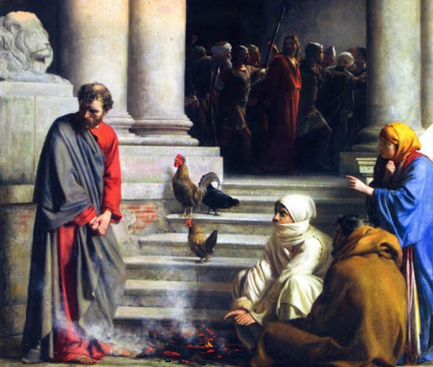 Pedro había llegado hasta el lugar donde las autoridades del templo interrogaban a Jesús y esperaba abajo en el patio. Hacía frío, los criados habían encendido un fuego y Pedro se acercó para calentarse. Entonces una de las sirvientas lo identificó y dijo que había estado con Jesús el de Nazaret (14: 66-7). Pedro se apresuró a negar lo que acababa de escuchar asegurando que ni conocía a Jesús ni sabía de lo que hablaba. En un intento de alejarse del peligro, incluso salió a la entrada. En ese momento, como Jesús había anunciado, cantó el gallo.